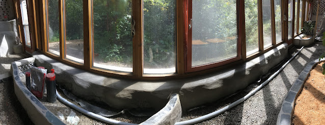 One last bit of stucco left to complete the interior finish. Guess what it is? Yes, it is the exposed tires in the stem-wall.